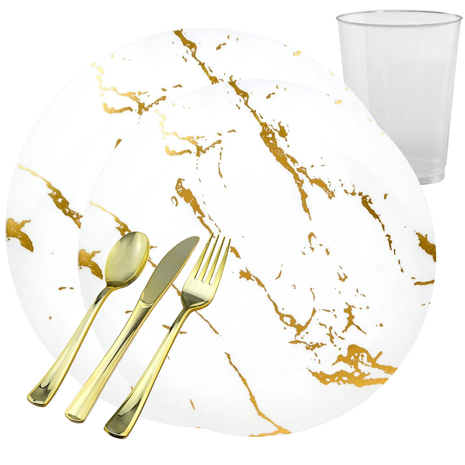 *BUY BULK* Gold Stroke White s Disposable Plastic Dinner Tableware COMBO Set