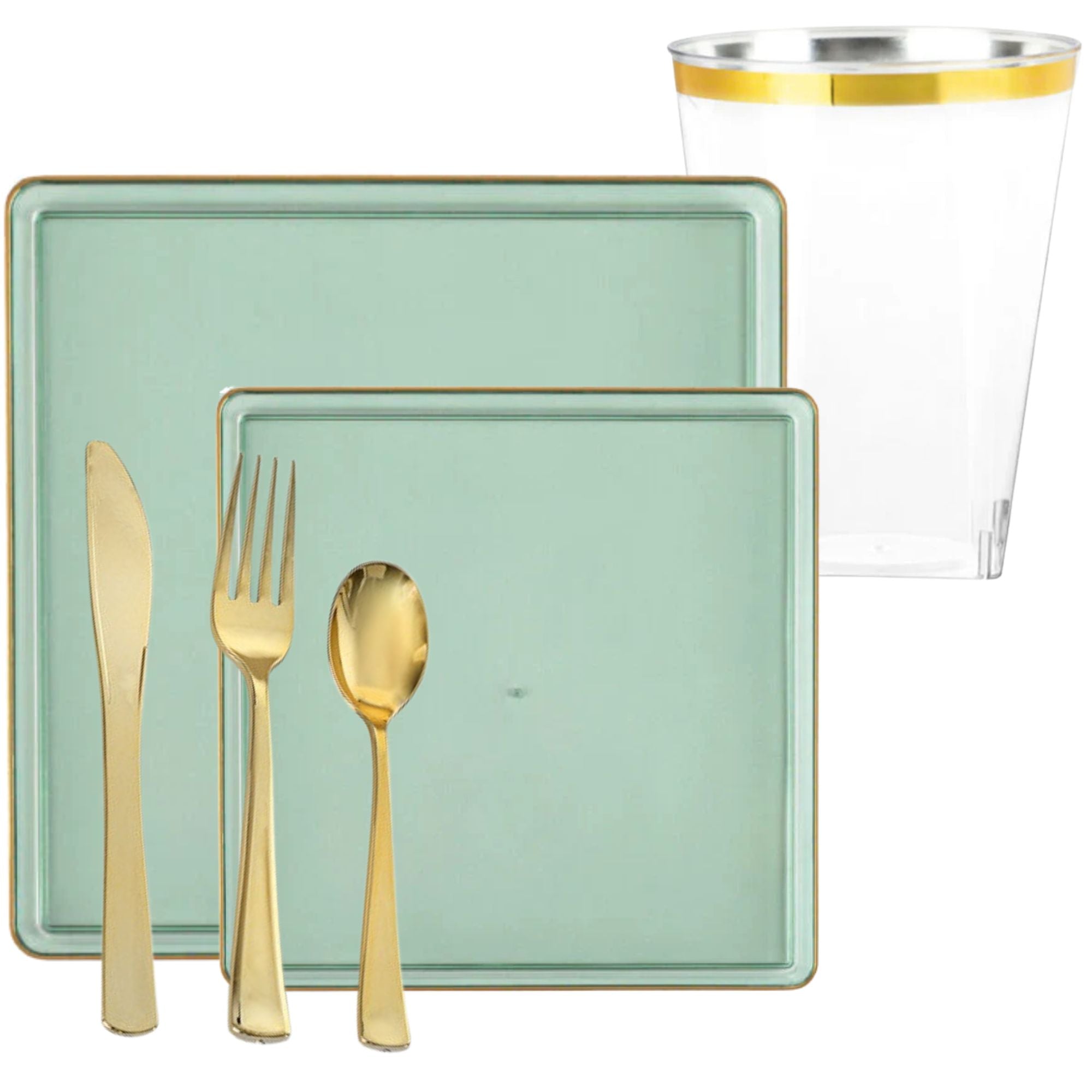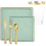 *BUY BULK* The Edge Collection Elegant Transparent Green with Gold Rim Square Dinner Tableware COMBO Set