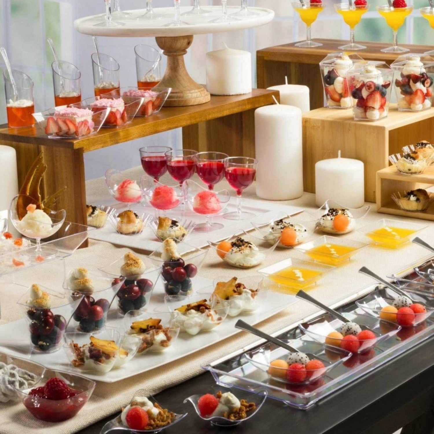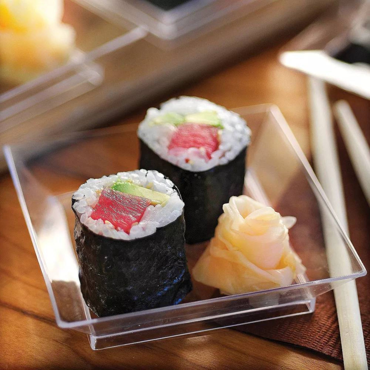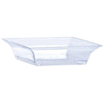Heavyweight clear plastic mini square footed dish, 12 Per Pack. It takes a Mini to make a big impression. Mini Entertainers are designed for all occasions, banquets, parties, upscale catering and home. BPA Free, disposable plastic, do not use in microwave, handwashing is recommended.