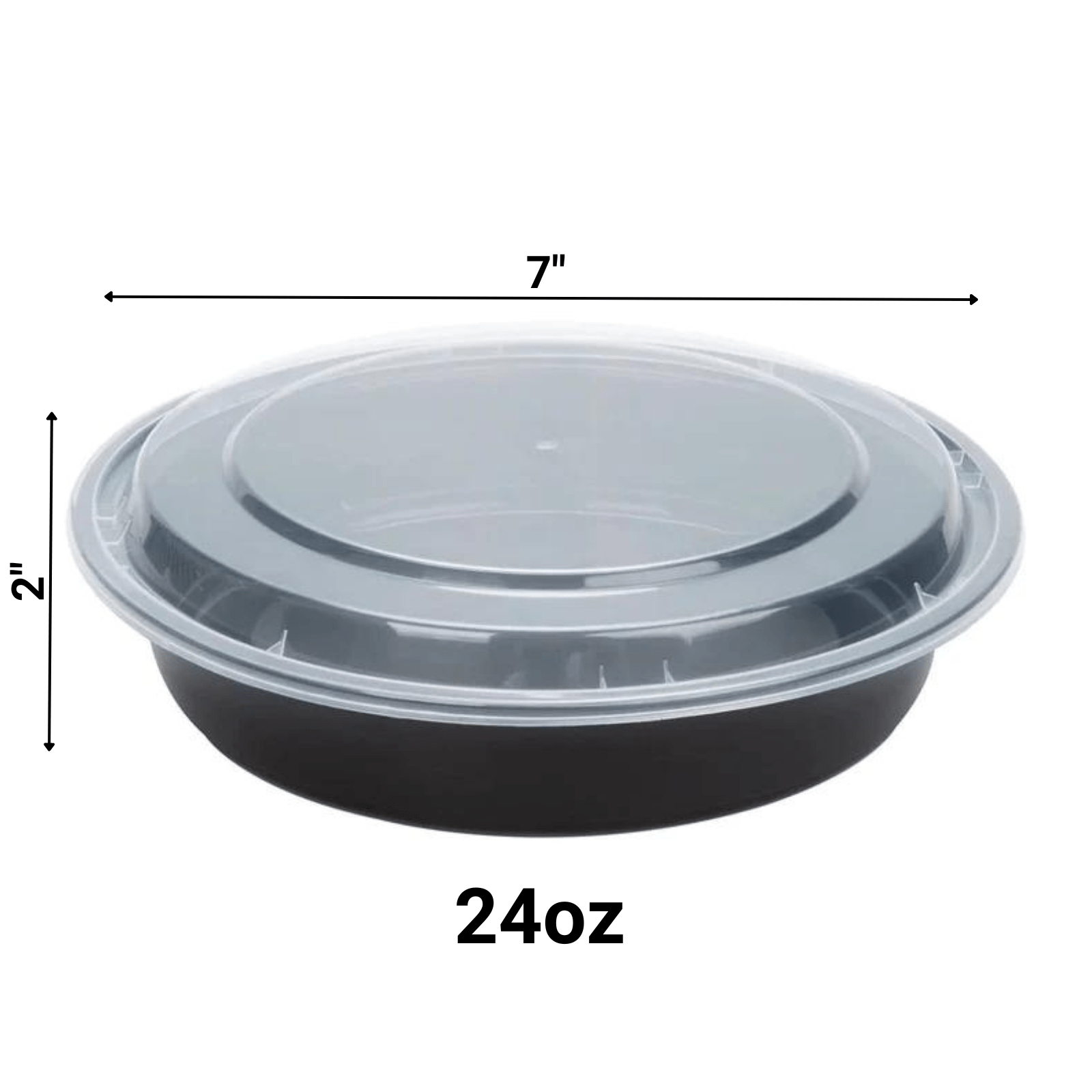 Introducing our 24 oz. Black Round Microwavable Container with Clear Dome Lid. It's durable, microwave- and freezer-safe, BPA-free, and Kosher-certified. Made in China, it's the epitome of convenience and quality.