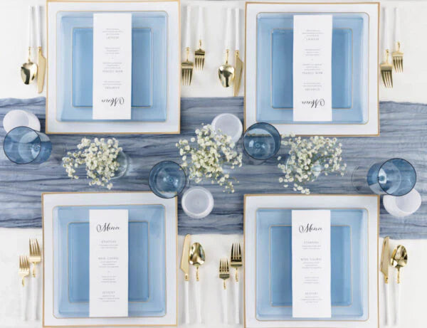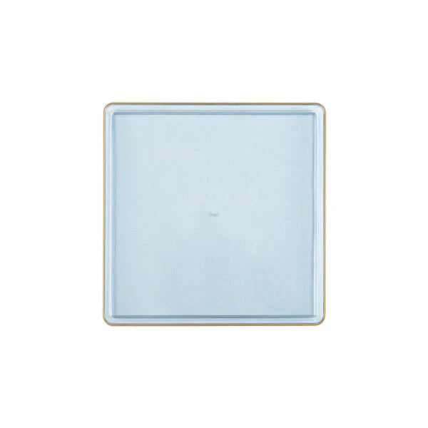 Enhance your celebration with The Edge Collection 7.75" Transparent Blue Square Plastic Plates featuring a sophisticated gold rim. These BPA-free disposable plates combine a translucent blue shade with a luxurious gold trim, perfect for weddings, birthdays, or any elegant occasion. Designed to serve appetizers, salads, and desserts, they provide a stylish and convenient dining solution.