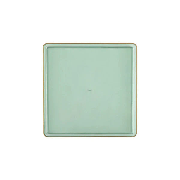 Add a fresh and elegant touch to your event with The Edge Collection 7.75" Transparent Green Square Plastic Plates featuring a refined gold rim. These BPA-free disposable plates showcase a translucent green hue complemented by a luxurious gold trim, perfect for weddings, parties, or any sophisticated gathering. Ideal for serving appetizers, salads, and desserts, they blend style and convenience effortlessly.