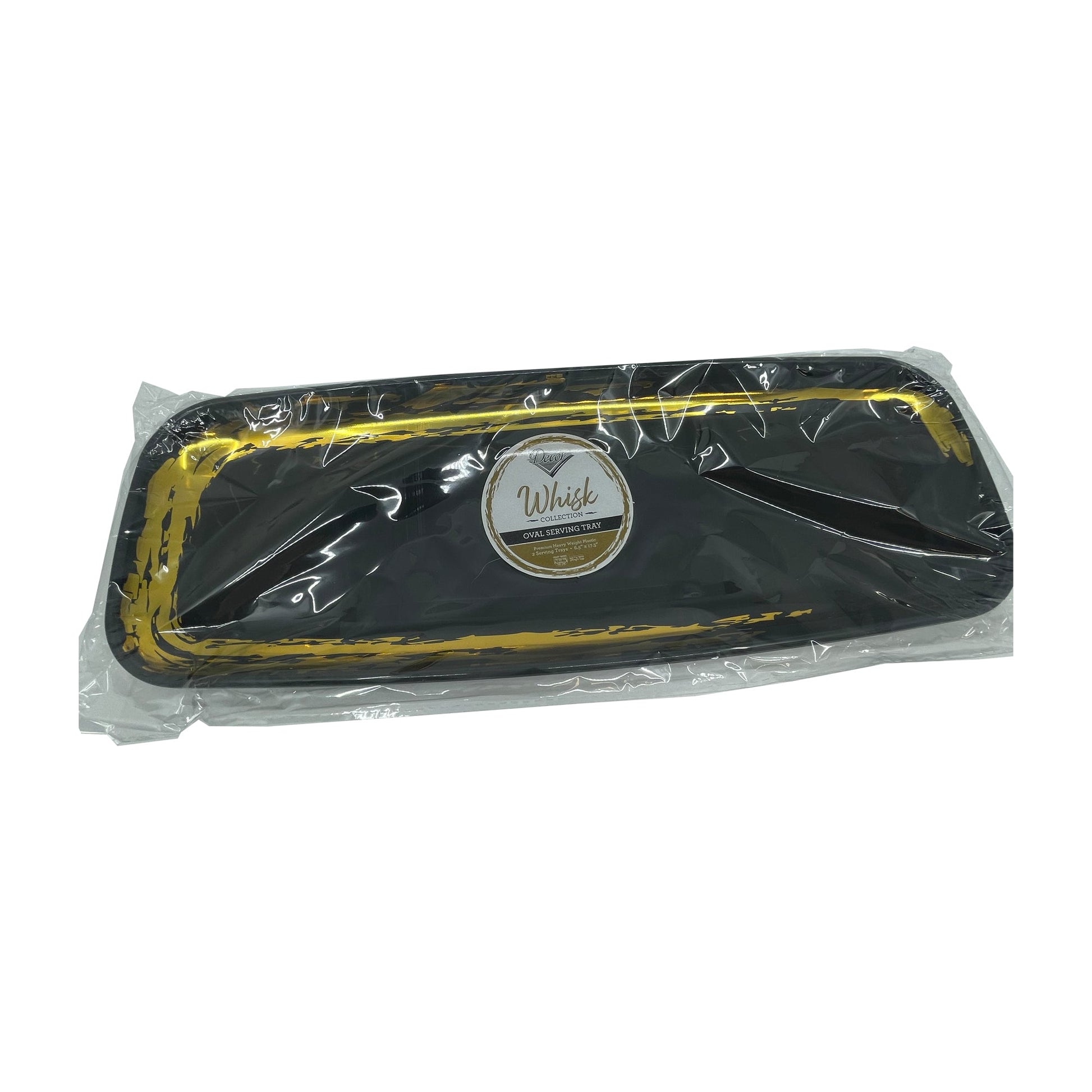 High-Quality Material: Made from durable, black plastic, these serving trays provide a robust and reliable solution for your serving needs, ensuring they can withstand frequent use. Elegant Design: The trays feature a sleek, oval shape, enhanced by striking gold accents, offering a luxurious aesthetic that can complement any décor, from traditional to contemporary. Versatile Use: Perfect for serving a variety of items, from appetizers and hors d'oeuvres to desserts and drinks, these trays can cater to any occasion, whether it's a formal dinner party or a casual get-together.