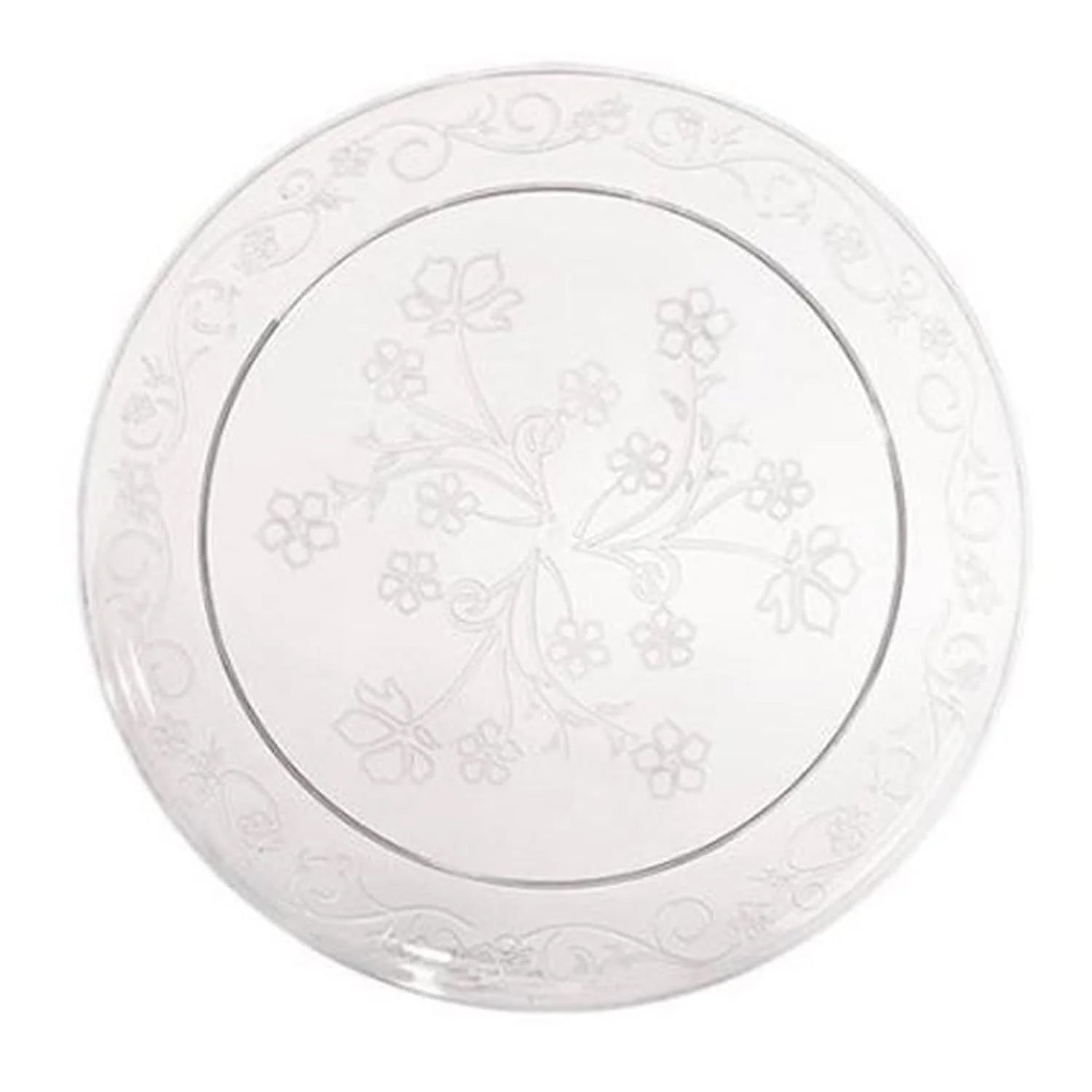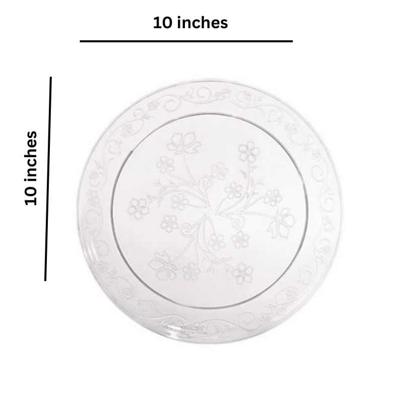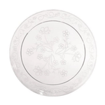 Hanna K D'VINE 10" Clear Plastic Plate, 20 Count. Hard Plastic. Designed for all occasions, banquets, parties, upscale catering and home. Etched design of flowers, leaves and vines. Part of a Set that includes 4 plates (10", 9", 7" 6.25"), bowls (10 ounce, 6 ounce) and 1 ounce shot cup. Disposable.