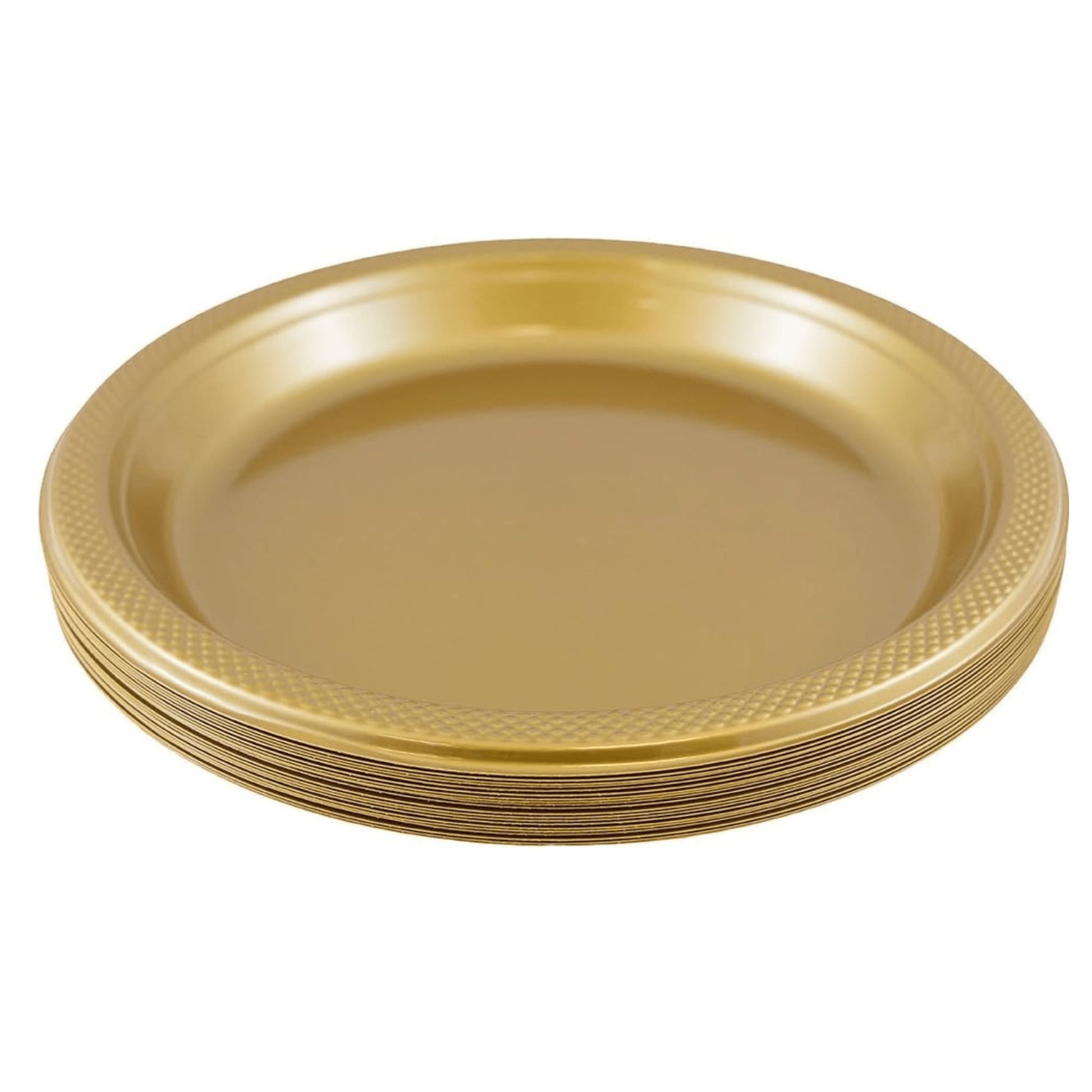 Enhance the elegance of your table with the Hanna K. Signature 7" Plastic Gold Plate. Featuring a luxurious gold finish, this plate is perfect for serving appetizers, desserts, or side dishes at any special occasion. Made from durable, high-quality plastic, it combines the beauty of fine china with the convenience of disposability. Ideal for weddings, parties, or festive gatherings, these plates add a touch of sophistication while making cleanup effortless.