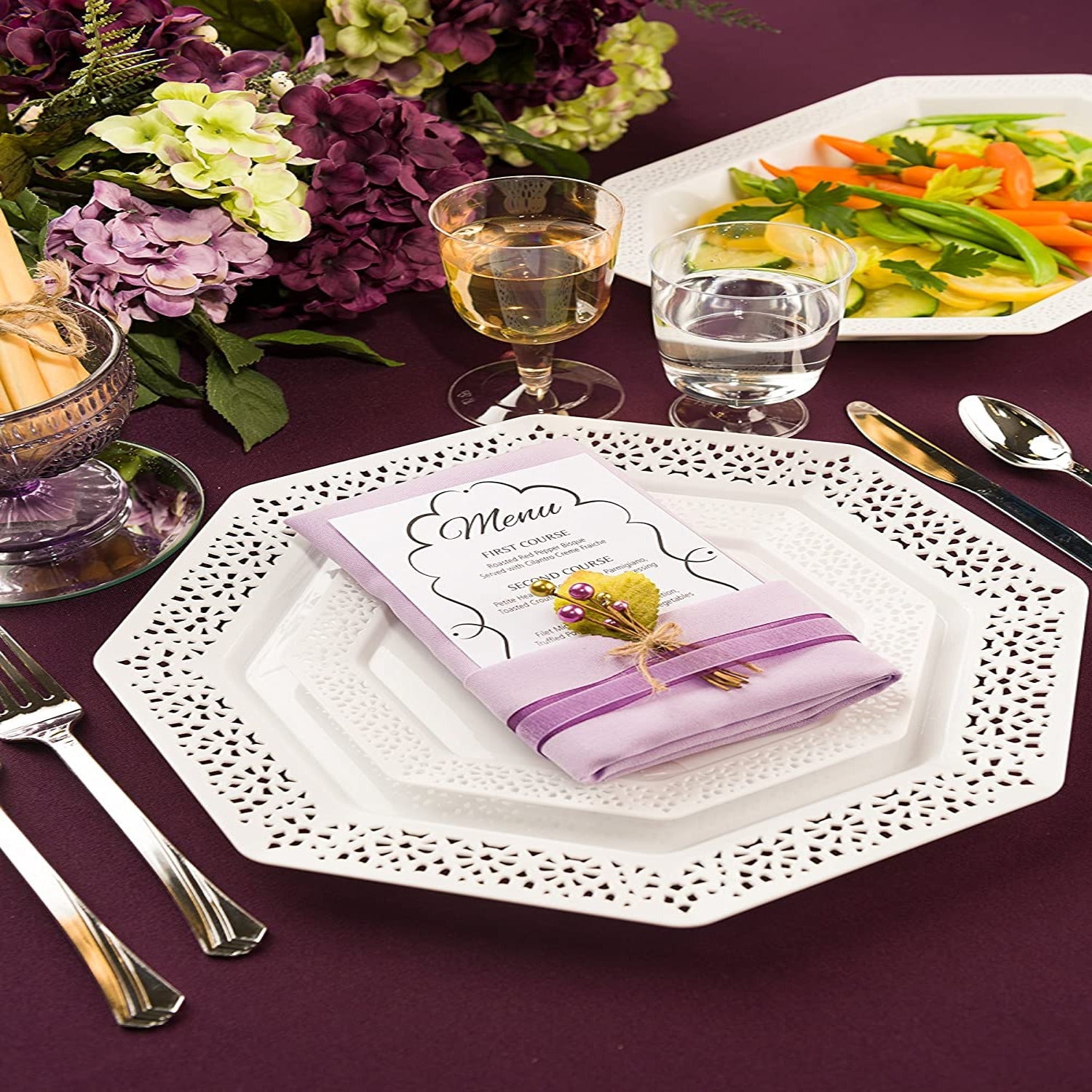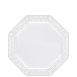 Introducing our Dramatically Elegant Dinnerware: Octagonal plastic plates adorned with a white lace-style cutout around the rim. These plates exude sophistication and charm, perfect for elevating any dining experience or special occasion.