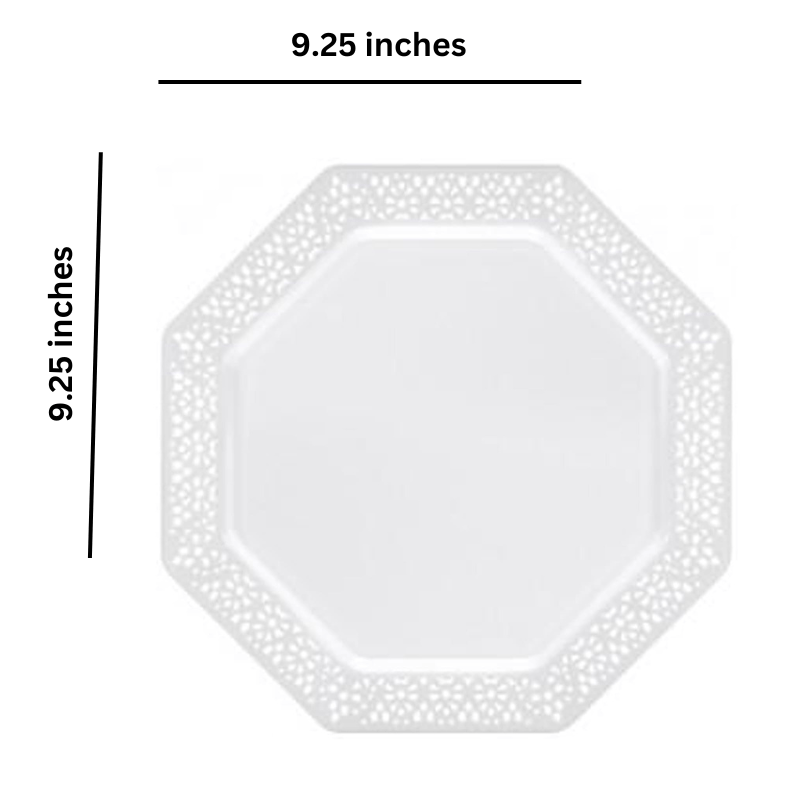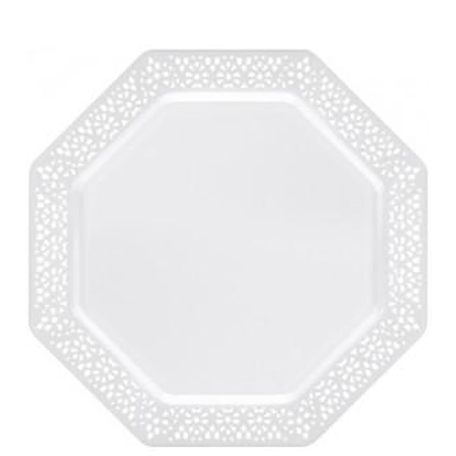 Introducing our Dramatically Elegant Dinnerware: Octagonal plastic plates adorned with a white lace-style cutout around the rim. These plates exude sophistication and charm, perfect for elevating any dining experience or special occasion.