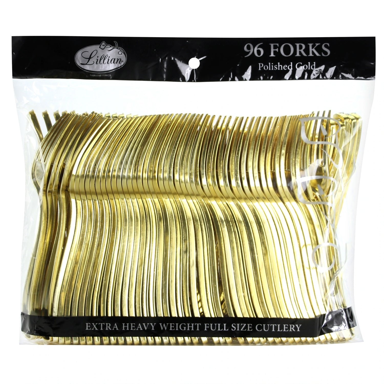 Lillian Table settings Polished Silver Plastic Cutlery. 96-Pack. Designed for all occasions, banquets, parties, upscale catering, and home. Disposable; Do Not Microwave; Hand washing. Fork 7.5"