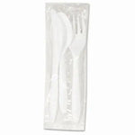 Ensure cleanliness and convenience with our White Medium Weight Wrapped Polypropylene Plastic Cutlery Pack. Each pack includes a disposable fork, knife, spoon, and napkin, all securely sealed in a clear plastic wrapper. Designed for single-use applications, this cutlery set is perfect for takeout, catering, events, healthcare facilities, and more. Save time on assembly and enhance hygiene standards with this ready-to-use cutlery solution.