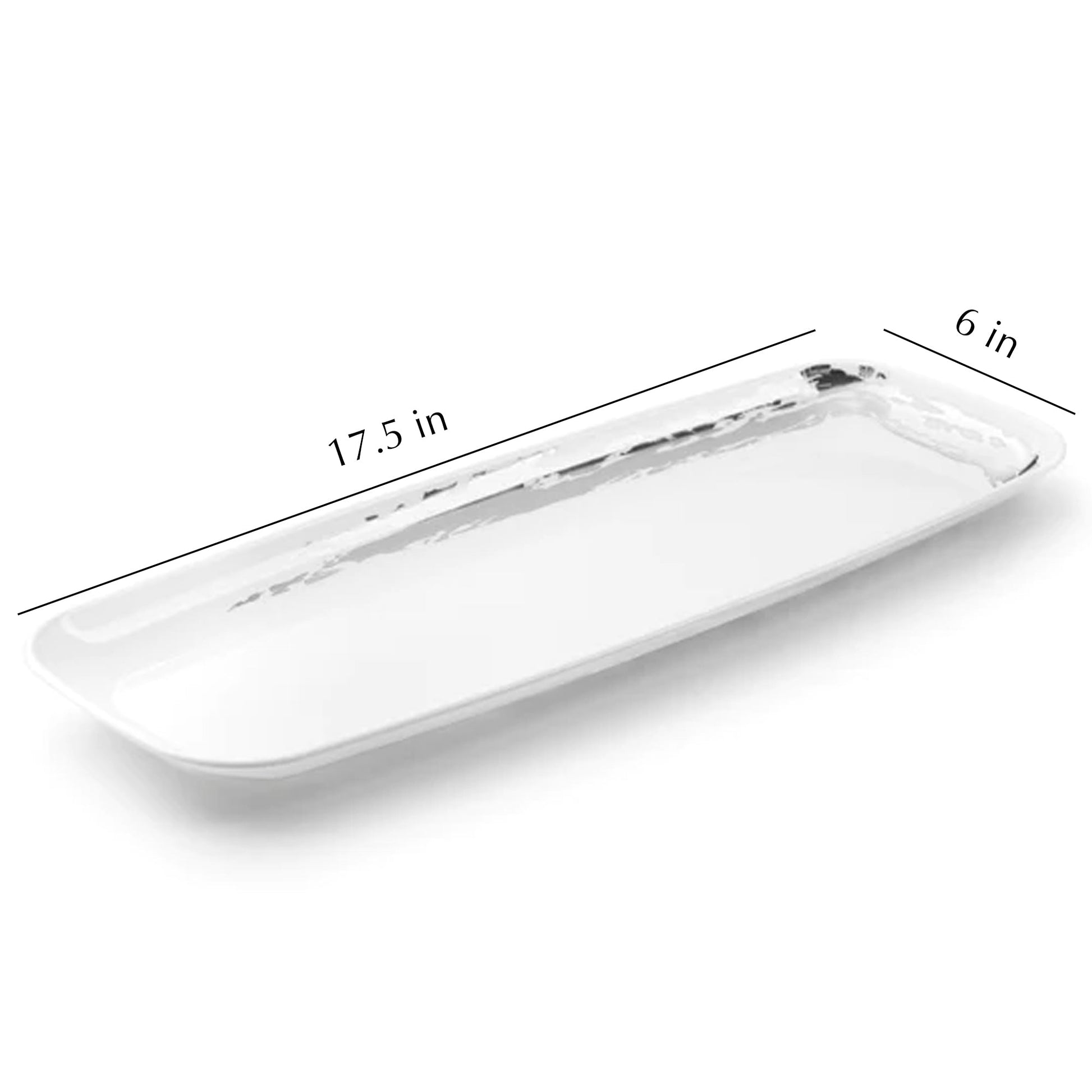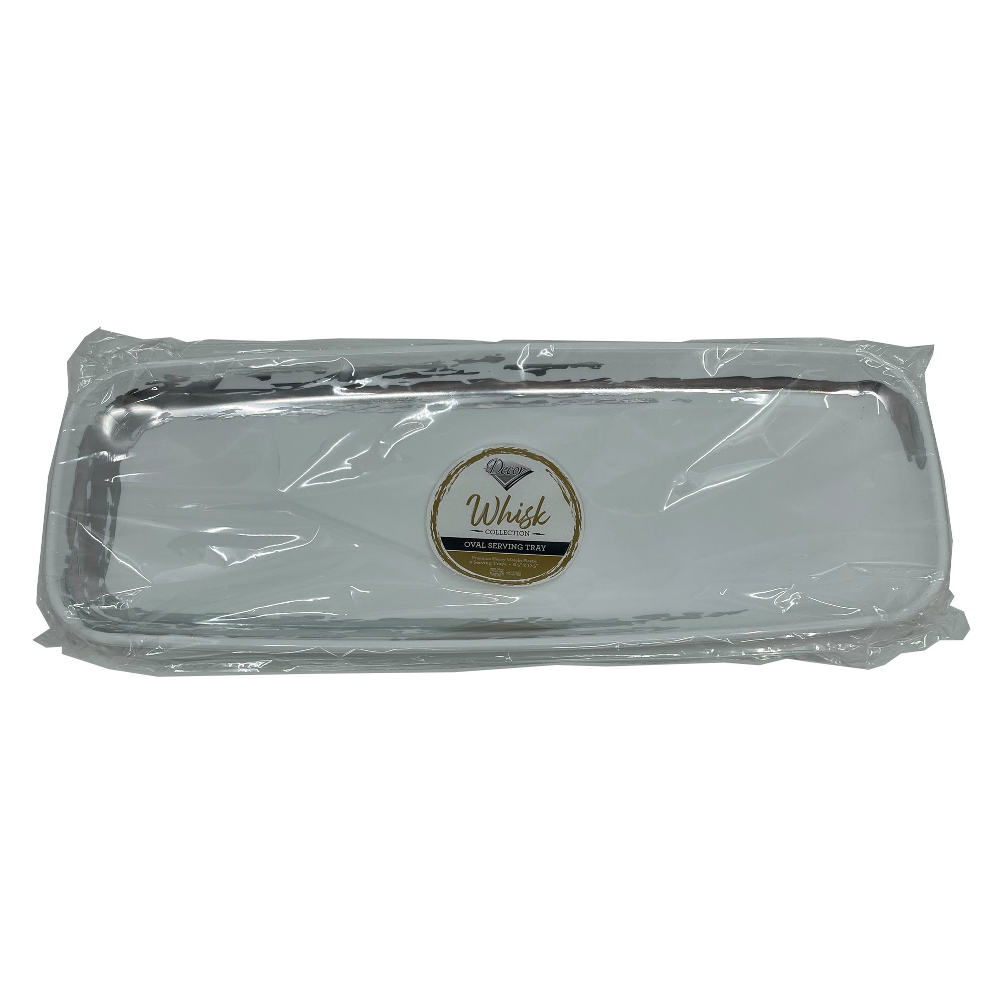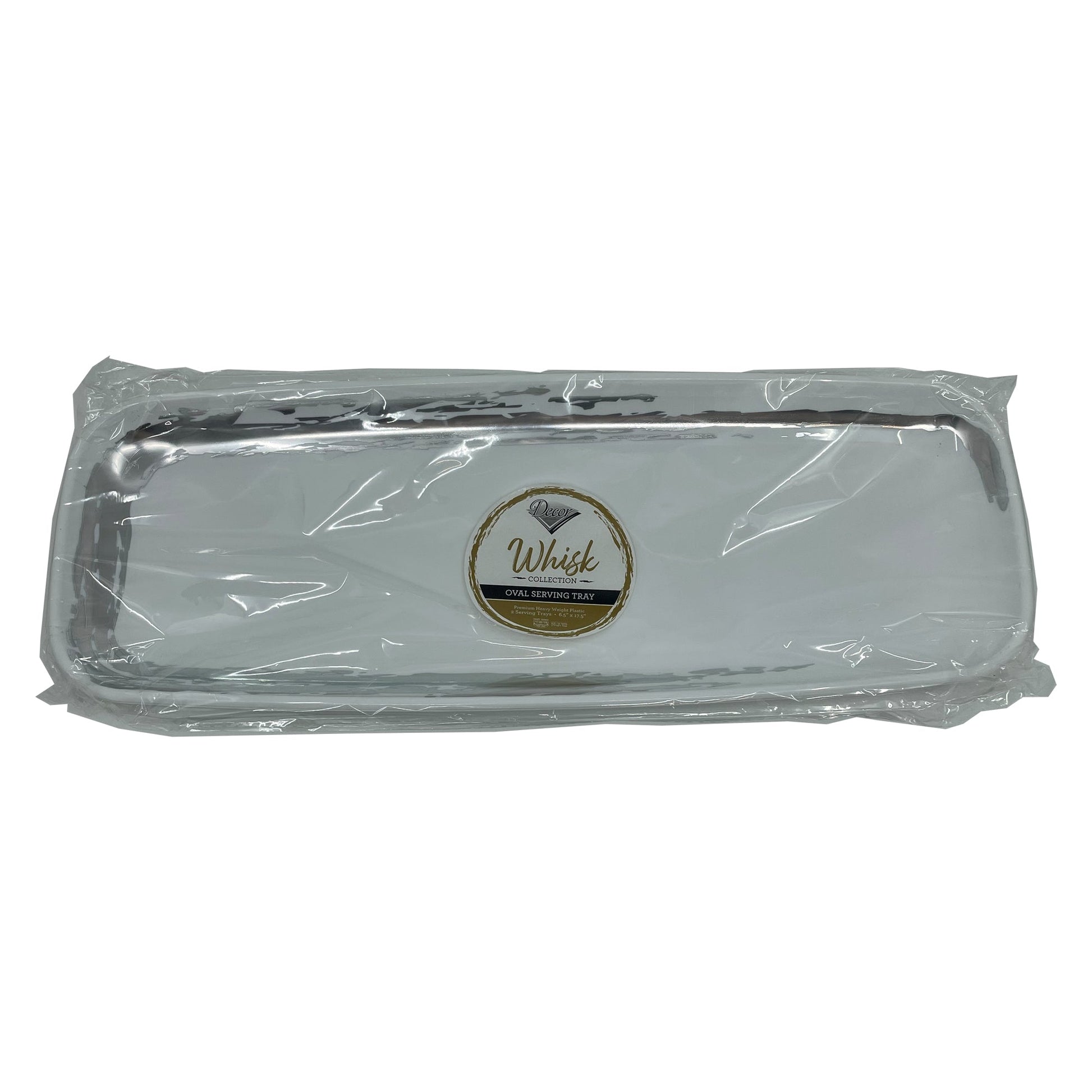 High-Quality Material: Made from durable, white plastic, these serving trays provide a robust and reliable solution for your serving needs, ensuring they can withstand frequent use. Elegant Design: The trays feature a sleek, oval shape, enhanced by striking silver accents, offering a luxurious aesthetic that can complement any décor, from traditional to contemporary. Versatile Use: Perfect for serving a variety of items, from appetizers and hors d'oeuvres to desserts and drinks, these trays can cater to any occasion, whether it's a formal dinner party or a casual get-together. Convenient Packaging: Available in a pack of 2, these trays allow for simultaneous serving of different items, making them a practical addition to any social gathering or event.